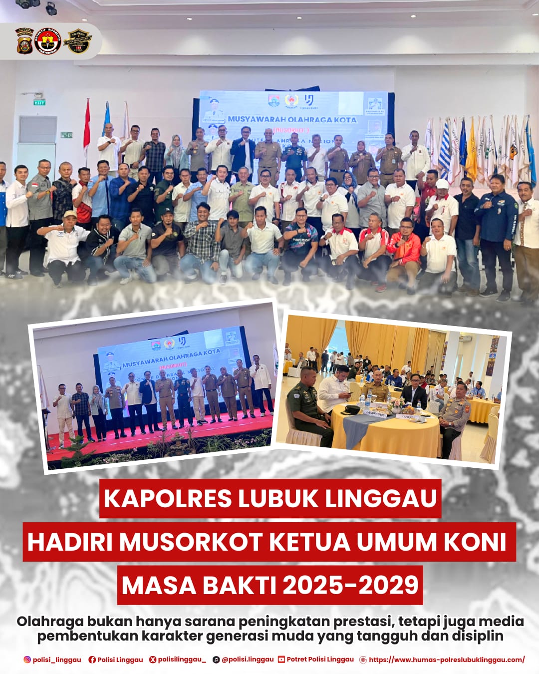 Lubuk Linggau — Kapolres Lubuk Linggau, AKBP Adithia Bagus Arjunadi menghadiri kegiatan Musyawarah Olahraga Kota (Musorkot) Lubuk Linggau yang digelar pada Senin, 26 Mei 2025. Acara dimulai pukul 10.00 WIB dan berlangsung di Ballroom lantai 5 Hotel Dewinda, Jalan Yos Sudarso, Kelurahan Watervang, Kecamatan Lubuk Linggau Timur I.