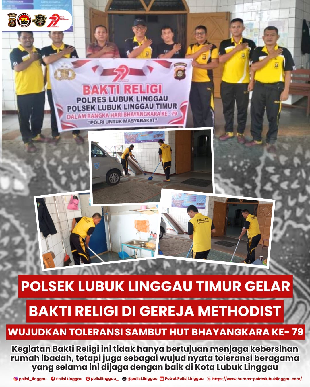 Lubuk alinggau - Sumsel. Dalam rangka menyambut Hari Bhayangkara ke-79, Polsek Lubuk Linggau Timur menunjukkan komitmen menjaga kerukunan dan toleransi antarumat beragama melalui kegiatan Bakti Religi. Kegiatan ini dilaksanakan di Gereja Methodist Kelurahan Eirakarya, Kecamatan Lubuk Linggau Timur II pada Senin, 16 Juni 2025.
