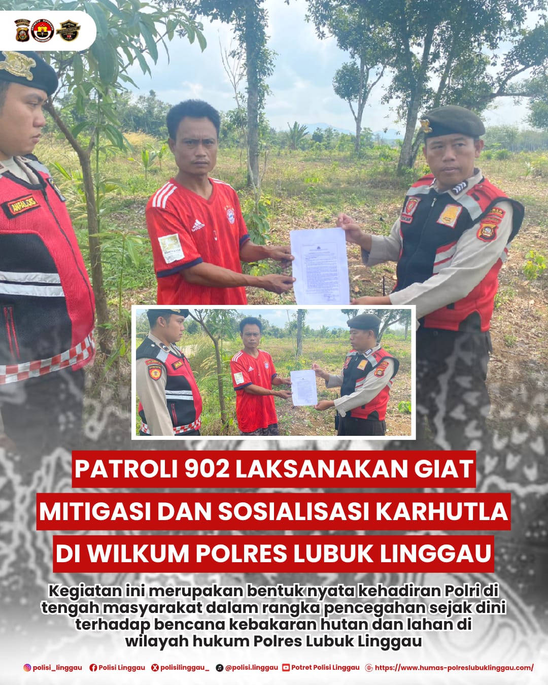 Lubuk Linggau, Sumsel - Dalam upaya menjaga keamanan lingkungan serta mencegah terjadinya kebakaran hutan dan lahan (karhutla), Piket Patroli Sat Samapta 902 Polres Lubuk Linggau melaksanakan kegiatan Patroli Sambang Mitigasi Karhutla di wilayah Kota Lubuklinggau. Kegiatan ini menjadi bagian dari langkah preventif untuk mengantisipasi potensi karhutla sekaligus mengedukasi masyarakat agar turut berperan aktif menjaga kelestarian lingkungan.