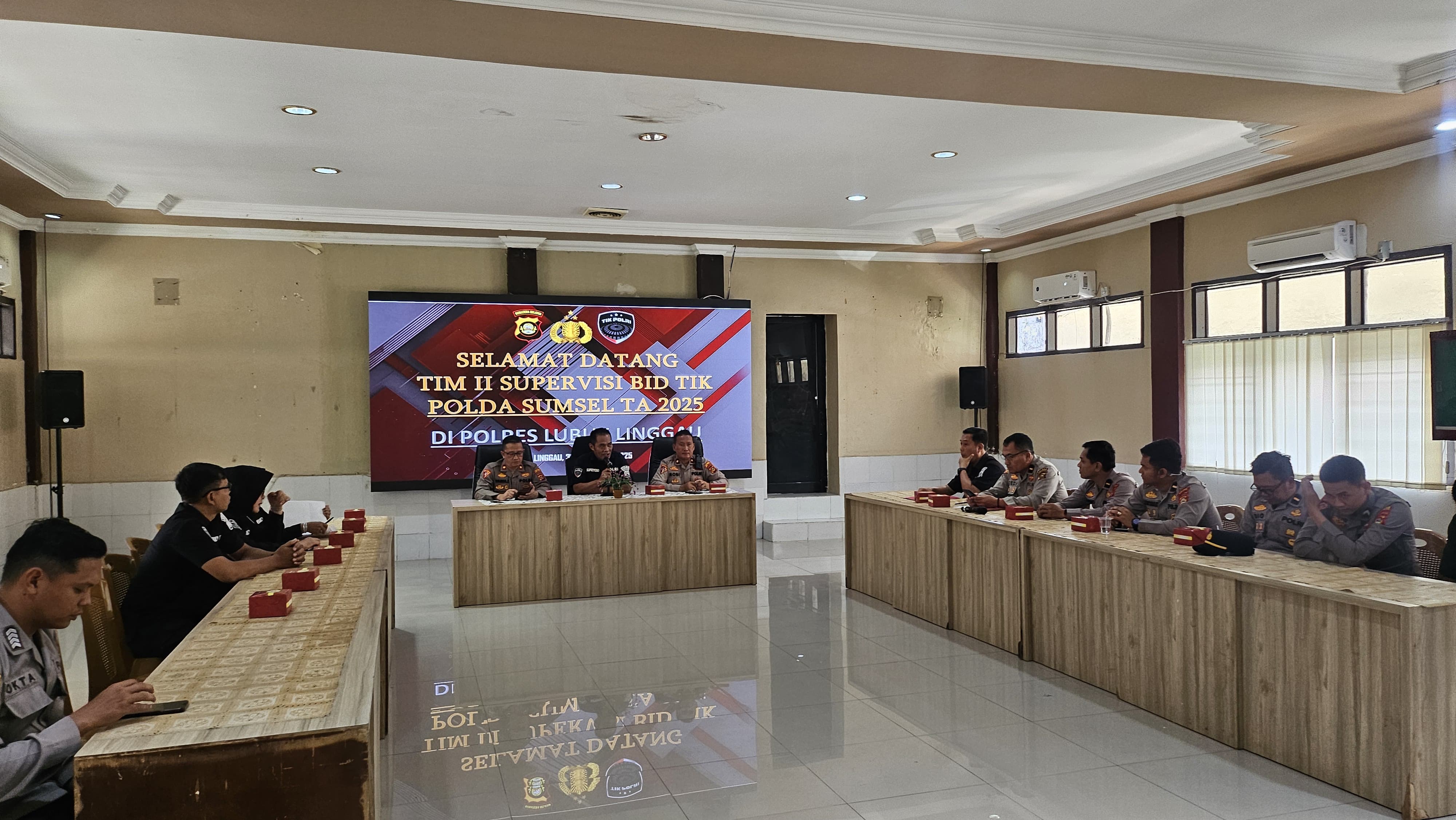 Suasana kegiatan berjalan dengan tertib dan penuh keakraban, ditandai dengan diskusi interaktif antara tim supervisi dan jajaran Polres Lubuk Linggau. Melalui kegiatan ini, diharapkan terjalin sinergi yang lebih kuat dalam pemanfaatan teknologi informasi untuk mendukung tugas pokok kepolisian di wilayah hukum Polres Lubuk Linggau.