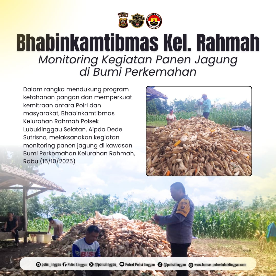 Lubuk Linggau — Dalam rangka mendukung program ketahanan pangan dan memperkuat kemitraan antara Polri dan masyarakat, Bhabinkamtibmas Kelurahan Rahmah Polsek Lubuklinggau Selatan, Aipda Dede Sutrisno, melaksanakan kegiatan monitoring panen jagung di kawasan Bumi Perkemahan Kelurahan Rahmah, Rabu (15/10/2025).