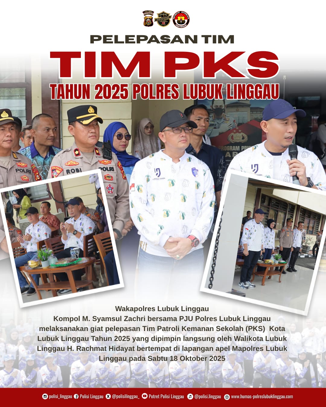 Pelepasan Tim PKS ini dilaksanakan dalam rangka keikutsertaan perwakilan Kota Lubuk Linggau pada ajang Lomba Patroli Keamanan Sekolah (PKS) Tingkat Polda Sumatera Selatan Tahun 2025, yang akan diselenggarakan pada Senin dan Selasa, 20–21 Oktober 2025 di Gedung Grand Ballroom Golden Sriwijaya, Jakabaring Palembang.