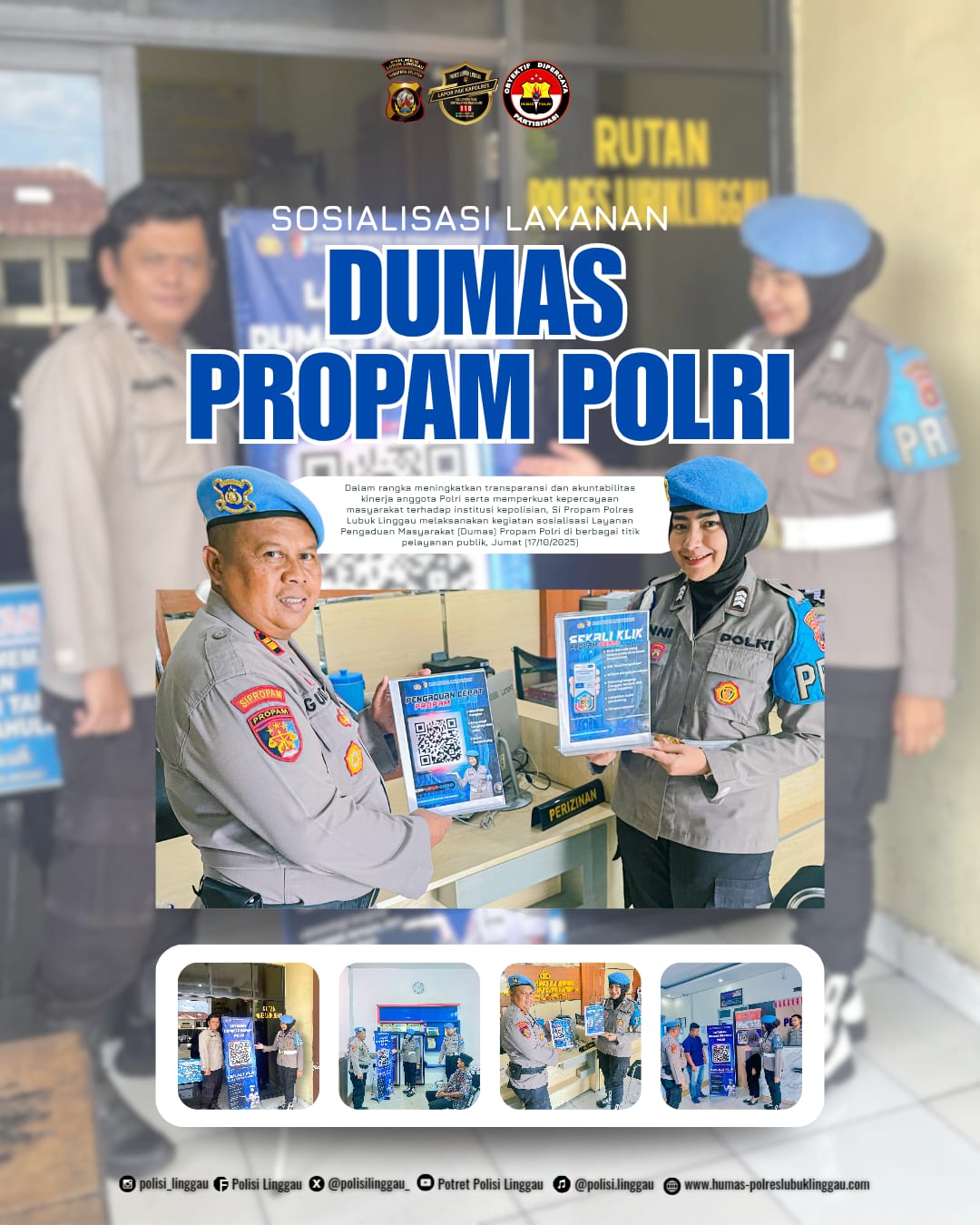 Polres Lubuk Linggau – Dalam rangka meningkatkan transparansi dan akuntabilitas kinerja anggota Polri serta memperkuat kepercayaan masyarakat terhadap institusi kepolisian, Seksi Profesi dan Pengamanan (Sipropam) Polres Lubuk Linggau melaksanakan kegiatan sosialisasi Layanan Pengaduan Masyarakat (Dumas) Propam Polri di berbagai titik pelayanan publik, Jumat (17/10/2025).