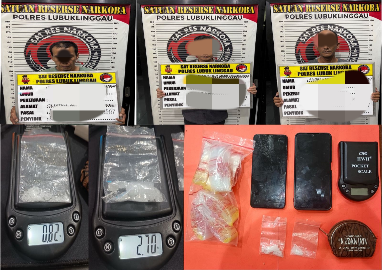 Ketiga pelaku yang diamankan masing-masing berinisial AM (50), warga Jl. Letkol Atmo RT. 006 Kelurahan Bandung Kiri, Kecamatan Lubuk Linggau Barat I; MF (50), warga Jalan Bukit Kaba RT.006 Kelurahan Dempo, Kecamatan Lubuk Linggau Timur II; dan AK (44), warga Jl. Puskesmas Taba Gg. Jariah RT.03 Kelurahan Cereme Taba, Kecamatan Lubuk Linggau Timur II.