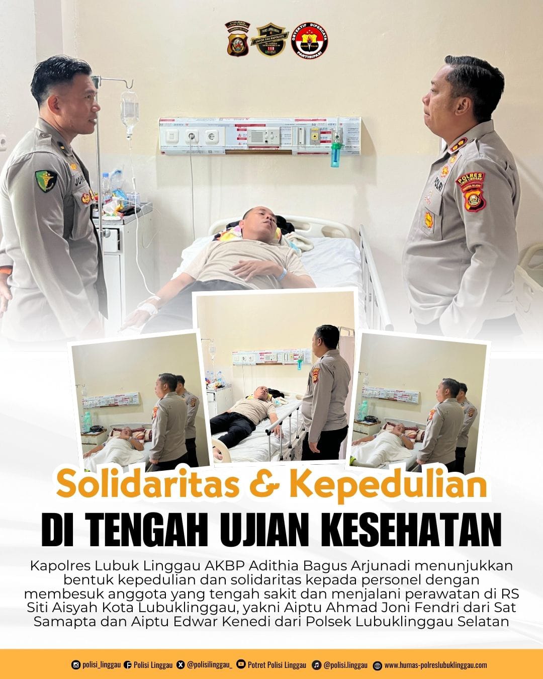 Kunjungan berlangsung di lantai II Ruangan A. Rahman, tempat dua personel dirawat, yakni Aiptu Ahmad Joni Fendri dari Sat Samapta dan Aiptu Edwar Kenedi dari Polsek Lubuklinggau Selatan. Kapolres memberikan dukungan moril, motivasi, serta mendoakan agar keduanya diberi kesembuhan dan segera dapat kembali melaksanakan tugas.