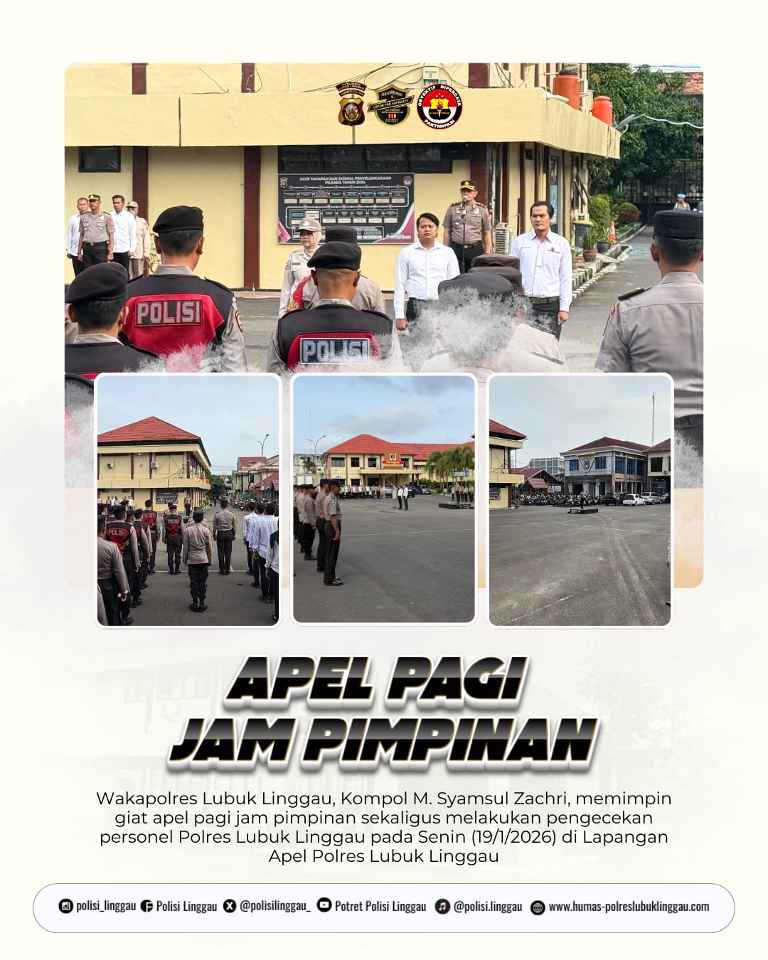 Melalui apel pagi dan pengecekan personel ini, Polres Lubuk Linggau terus berkomitmen menjaga kualitas kinerja, memperkuat budaya kerja yang disiplin, serta meningkatkan pelayanan yang humanis dan responsif kepada masyarakat.